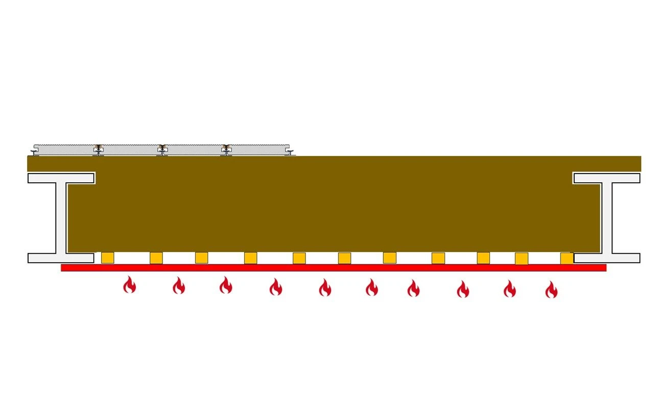 Bij dit type galerij zijn er enkele belangrijke aandachtspunten. De ondersteuning van de Envirodeck Classic Pro Deck planken moet elke elke 300mm hart op hart plaatsvinden. Onder de constructie wordt een onbrandbare plaat gemonteerd (ivm brandwerendheid van de constructie en hittegedrag onder dek). De naden tussen de planken worden voorzien van brandveilige voegrubbers om rookdoorslag (WRD) te voorkomen. Hiermee ontstaat dan naast een brandveilige vloer ook direct een waterkerend dek. De opbouw van de galerij ziet er dan als volgt uit: